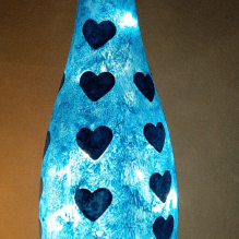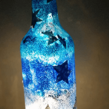 Jetzt kannst du mit einem spitzen Gegenstand Muster in die Farbe ritzen, also Farbe wieder abkratzen oder die aufgeklebten Sterne/ Herzen… wieder ablösen, wenn du magst. Außerdem kann die Flasche mit Edelsteinchen, Metalldraht… verziert werden. Probiere es einfach aus 🙂